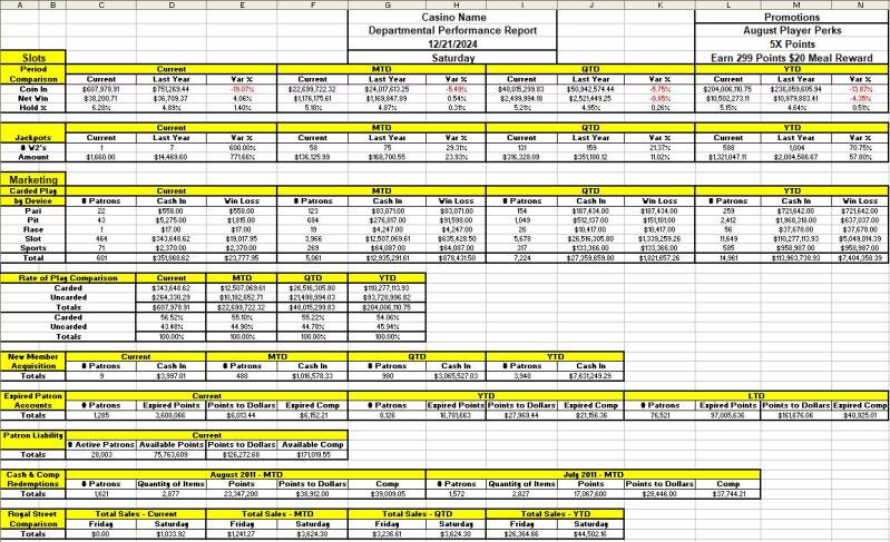 This flash report was published daily to the entire casino as a method for reviewing all activity recorded within the slot system (Oasis slot system). This report allowed for issues to be identified and for an investigation to be launched early enough to stem the potential for theft.